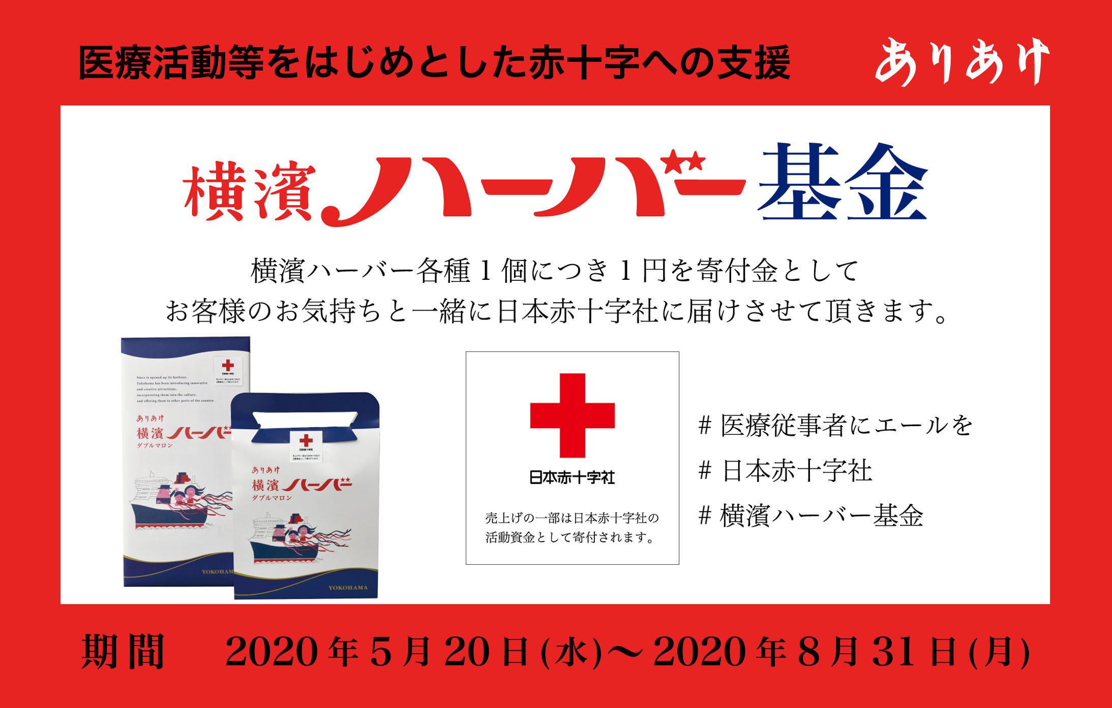 「新型コロナウイルスに関連した感染症」をはじめとした継続支援策として、2020年5月20日(水)~2020年8月31日(月)までハーバー1個につき1円寄付「横濱ハーバー基金」として医療活動等をはじめとした日本赤十字社への支援を行います。